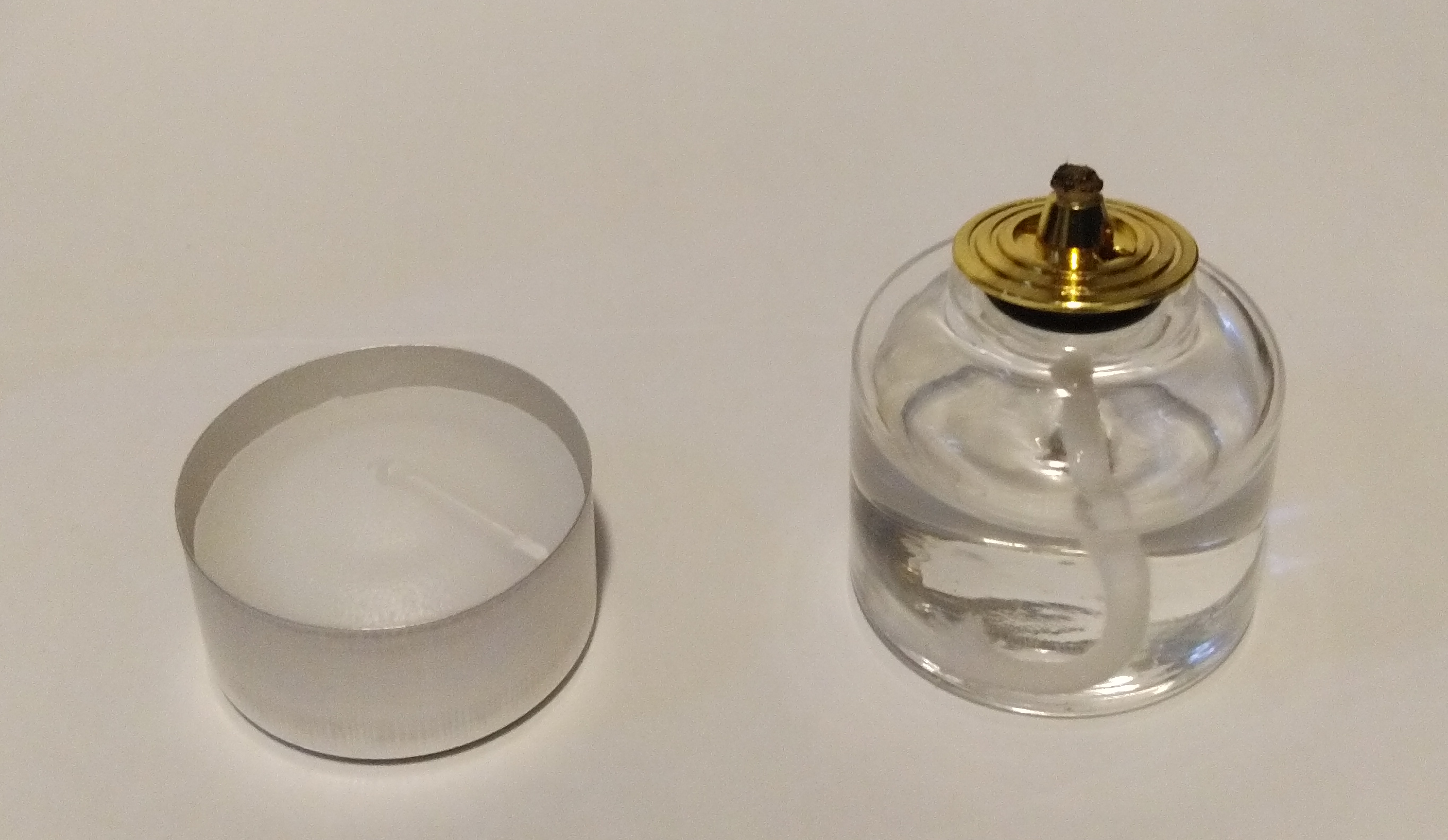 もっとも小生は蝋燭ではなく、パラフィンオイルを使ったオイルランプ(写真右)を使っています。