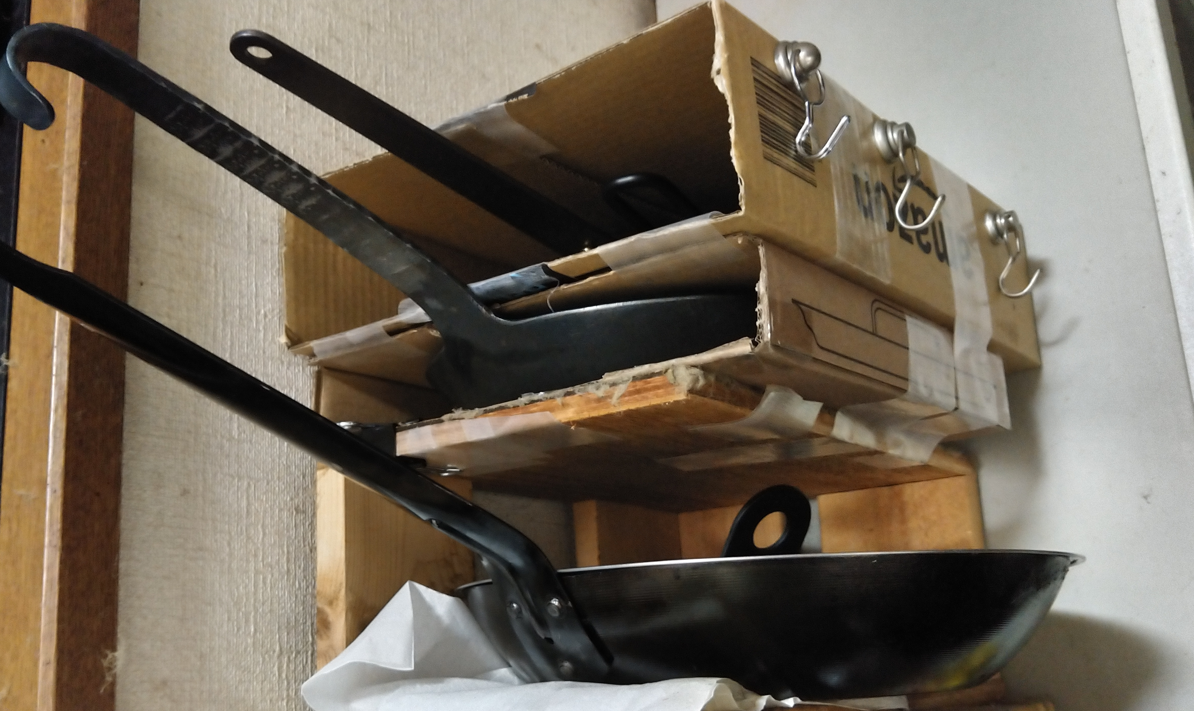 一番下の木製のものは, 大部以前に自作したフライパン用の棚なのですが
